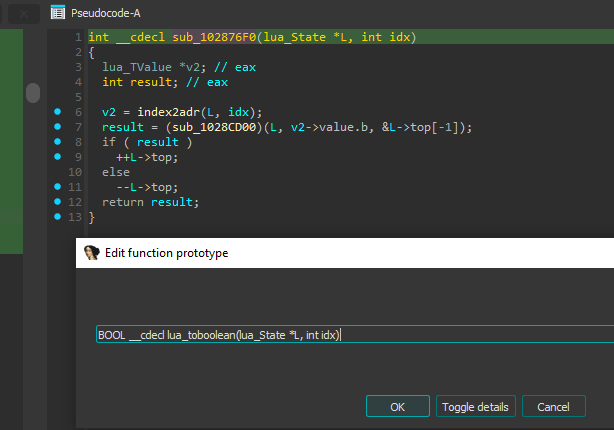 Once a non-guessed prototype is applied to a function (either specified by the user, or from debug info), it changes color to show this fact. It is a bit more obvious in the default (light) color theme - the prototype changes from gray to blue. In addition, the entry in the Function list becomes bold.